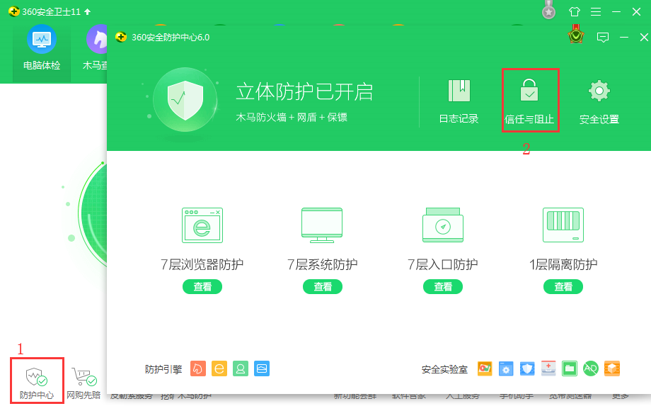 1、找到360安全卫士的图标,点击打开360安全卫士界面;点击软件主界面左下角的“防护中心”图标,在弹出的界面中,点击“信任与阻止”图标;