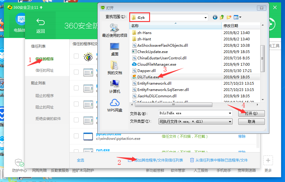 2、在信任与阻止窗口中点击左侧“信任的程序”菜单项,在右侧窗口中,点击“添加其他程序/文件到信任列表”;在弹出窗口中定位到安装目录下,选择DiLiTuKe.exe文件,点击打开;