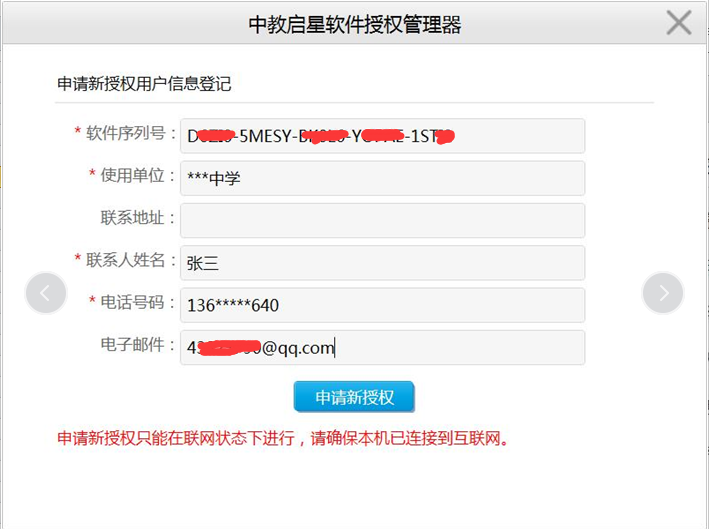 图标,双击图标,进行激活软件操作。激活操作只能在互联网联通状态下进行,请确保本机可正常访问互联网。输入软件序列号(安装盘中或其它途径获得),使用单位,联系人姓名,电话号码,电子邮件等信息,点击申请新授权,软件即会联通服务器,自动验证信息,获取授权。