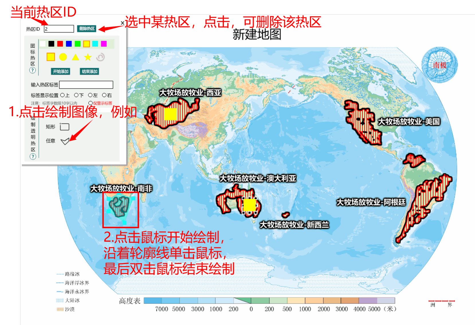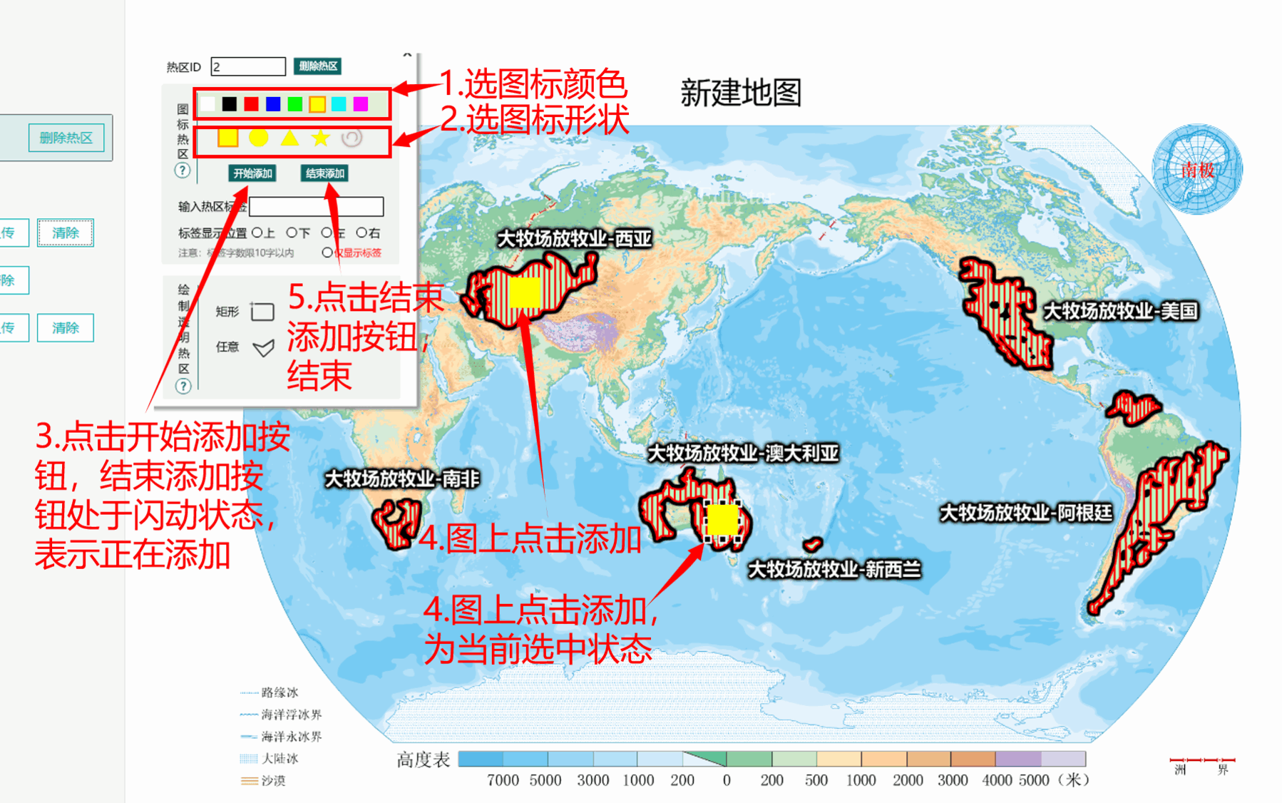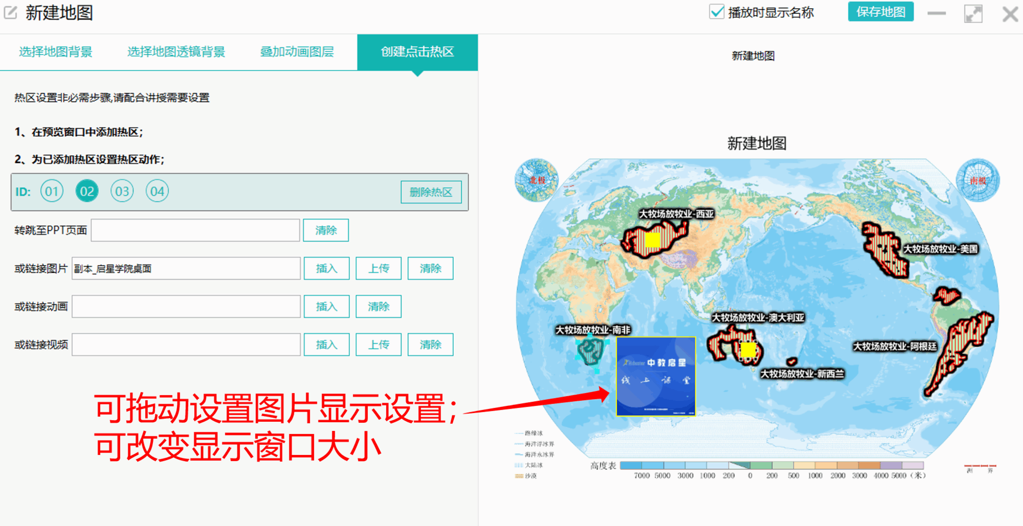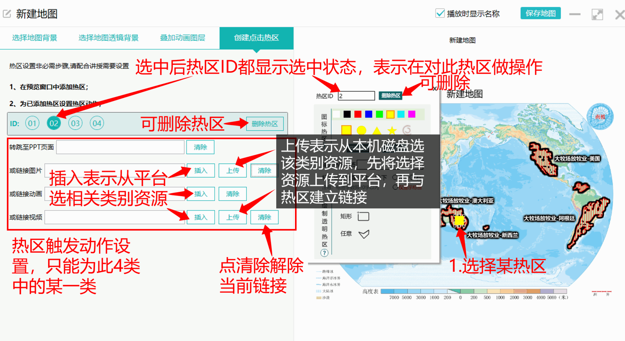 可在地图上添加管理热区。即在地图上做上标记,标记关联到某资源,播放的时候点击这个标记,即触发播放关联的资源。
