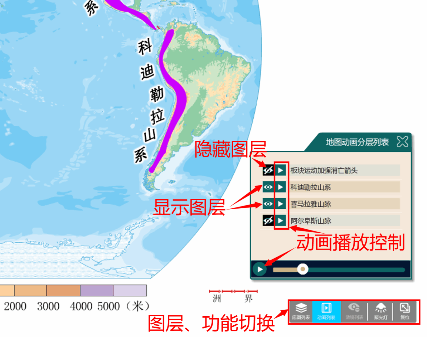 包括底图列表、动画列表、透镜列表、聚光灯功能。见下图