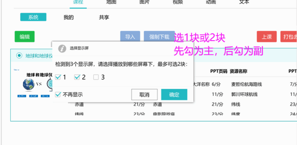 在课程播放时,若检测到播放课程的机器连接了多块显示屏,会自动弹出屏幕选择窗口,使用者可灵活选择将课程播放到其中的某一块或某两块屏幕上。