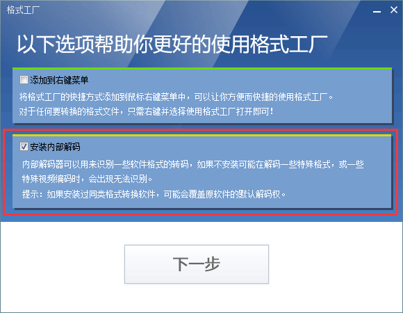 2.2 勾选“安装内部解码”选项