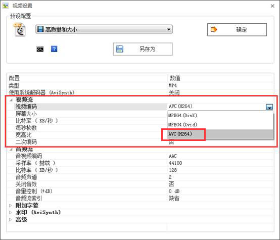 3.3 在视频设置—视频流—视频编码中选中 “AVC H264 ” 并点击“确定”保存更改。此步骤为最关键的步骤,请务必选择H264格式