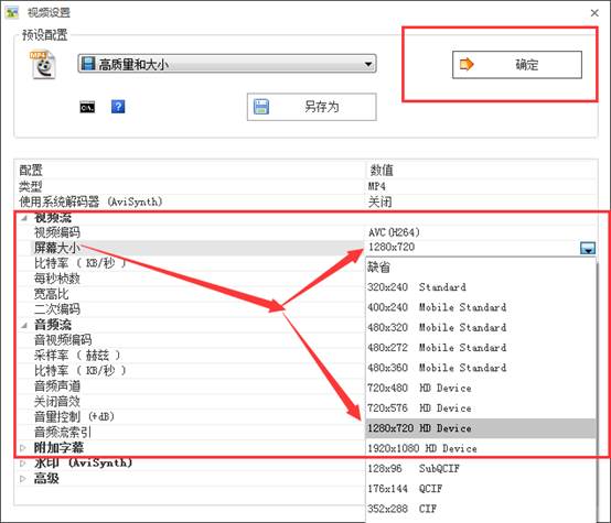 3.4 若视频屏幕大小(分辨率)超过1280*720,请在屏幕大小中选中“1280*720”并确定即可, 若未超过该尺寸,则不用设置该项。