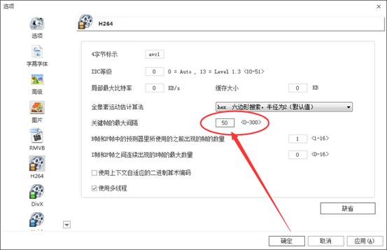 将“关键帧的最大间隔”配置修改为100以内的数值,推荐修改为50。